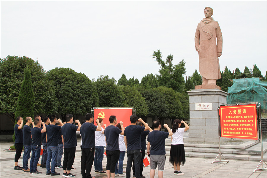 在楊闇公烈士陵園,全體黨員在烈士紀念碑前面對黨旗重溫入黨誓詞,并莊嚴承諾不忘初心跟黨走,牢記使命勇?lián)敗?/p>