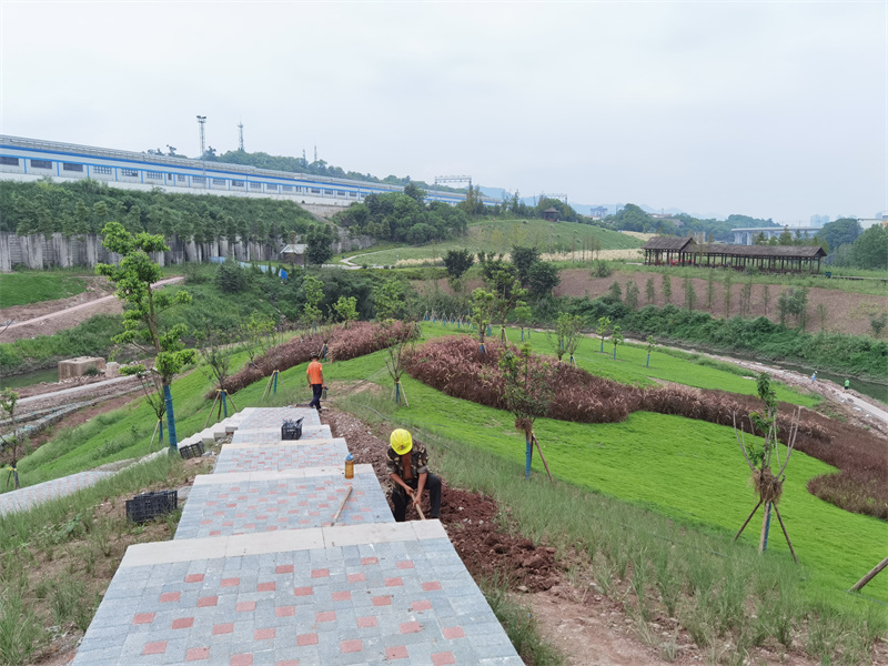 8月11日,記大渡口區跳磴河“清水綠岸”治理提升工程一期項目現場(chǎng),數十名工人在各自崗位上有序忙碌,樹(shù)木草籽等綠化已基本到位,步道地磚開(kāi)始鋪設,綠意在兩岸山坡蔓延。