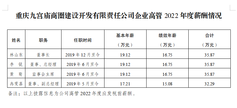 重慶九宮廟商圈建設開(kāi)發(fā)有限責任公司企業(yè)高管2022年度薪酬情況