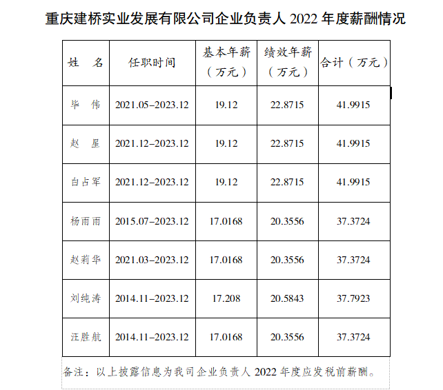 重慶建橋實(shí)業(yè)發(fā)展有限公司企業(yè)負責人2022年度薪酬情況